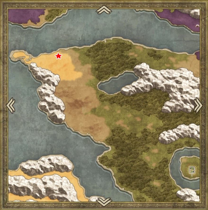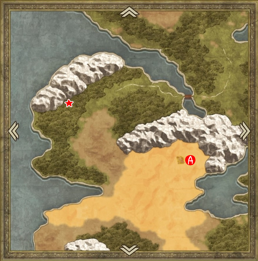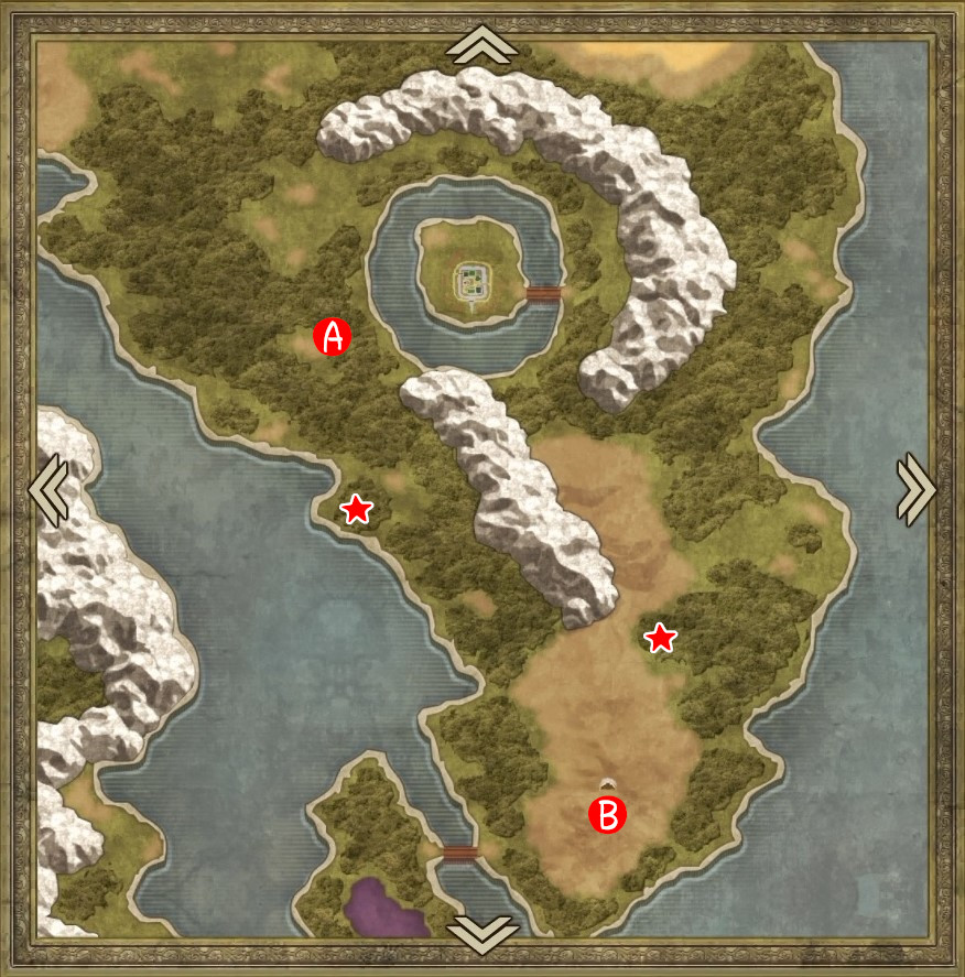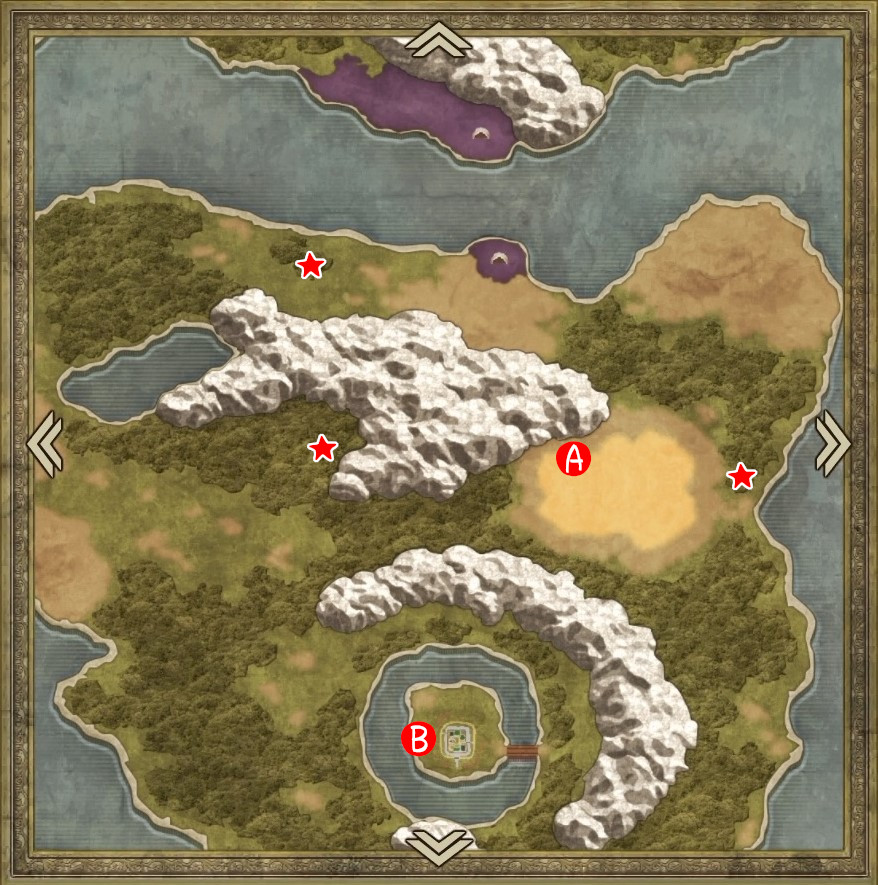 | A | 【ひみつの場所】 タルから「どくがのこな」「すばやさのたね」 左のヤシの木を調べると「やいばのブーメラン」 北側から中央の岩を調べると「はでな服」 |