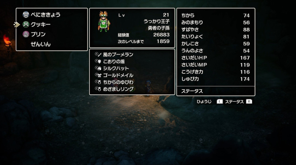 | HP | MP | 攻撃力 | 守備力 | すばやさ | 経験値 | ゴールド | 宝 |