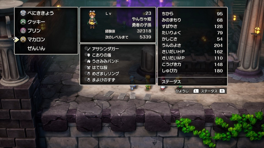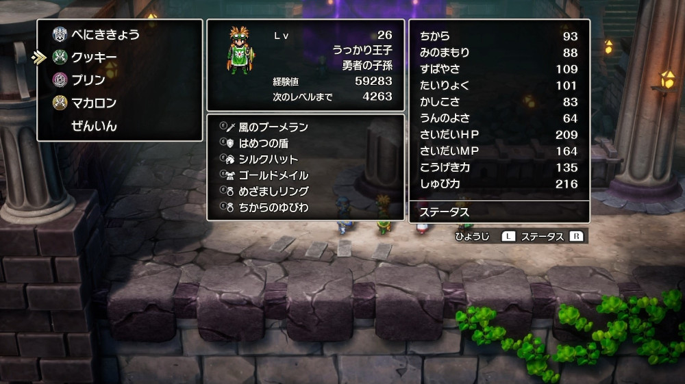 | HP | MP | 攻撃力 | 守備力 | すばやさ | 経験値 | ゴールド | 宝 |