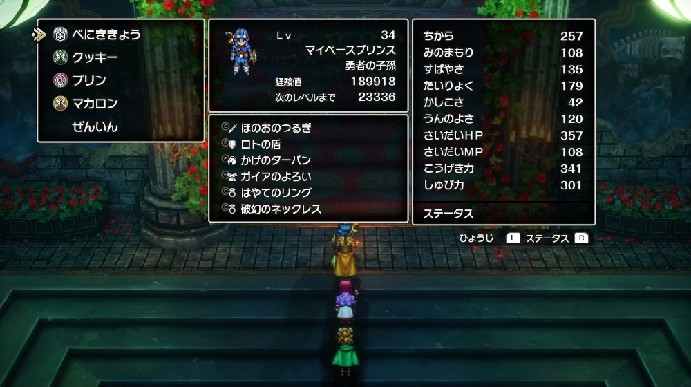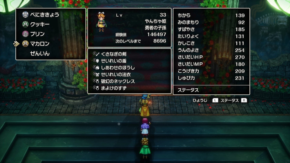 | HP | MP | 攻撃力 | 守備力 | すばやさ | 経験値 | ゴールド | 宝(盗) |