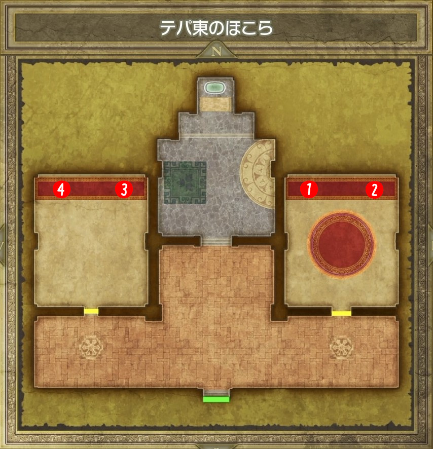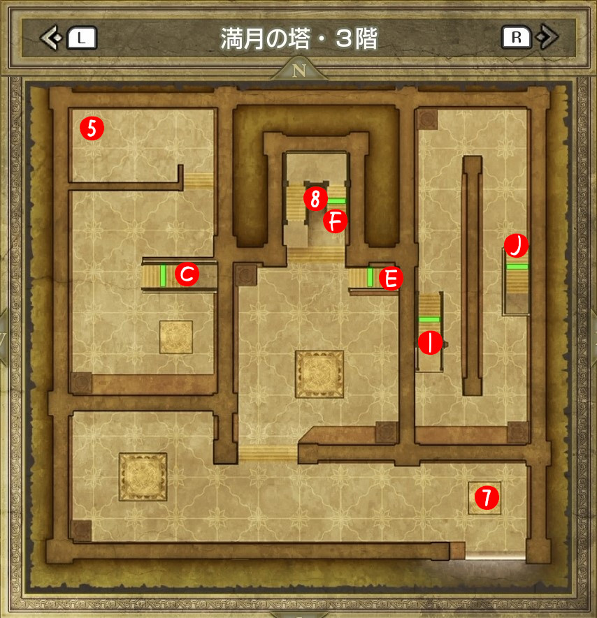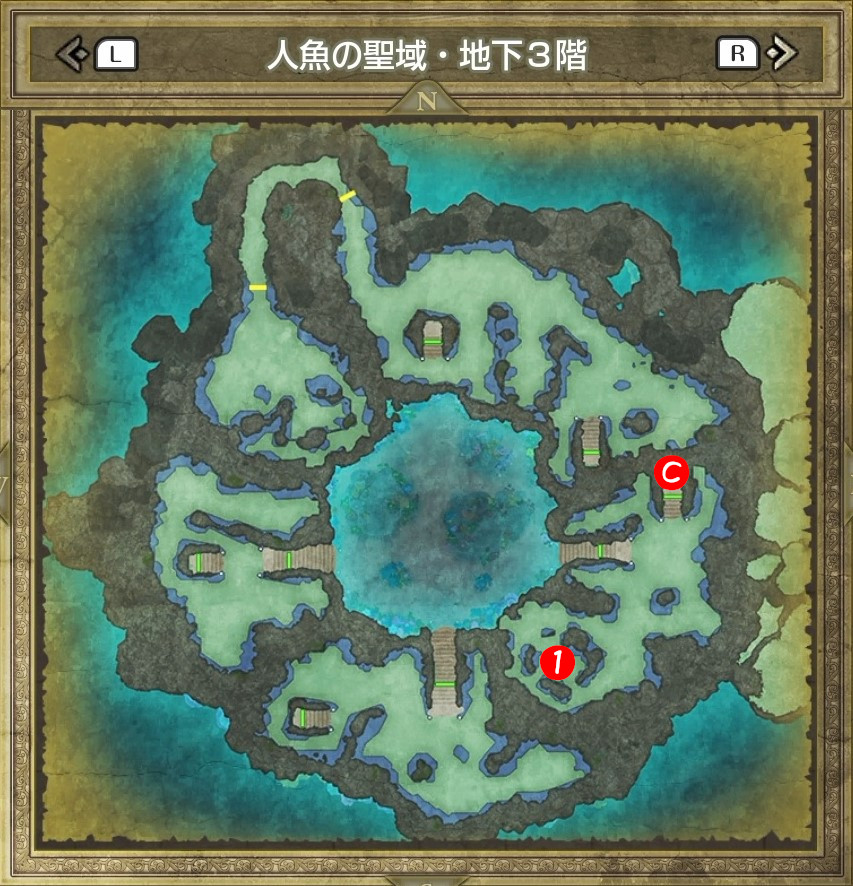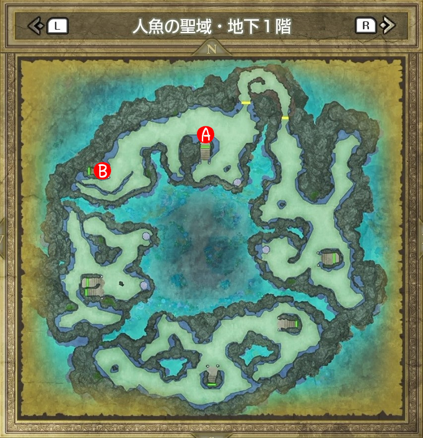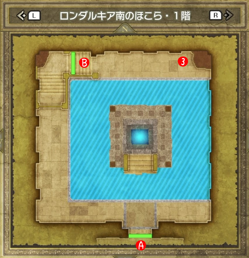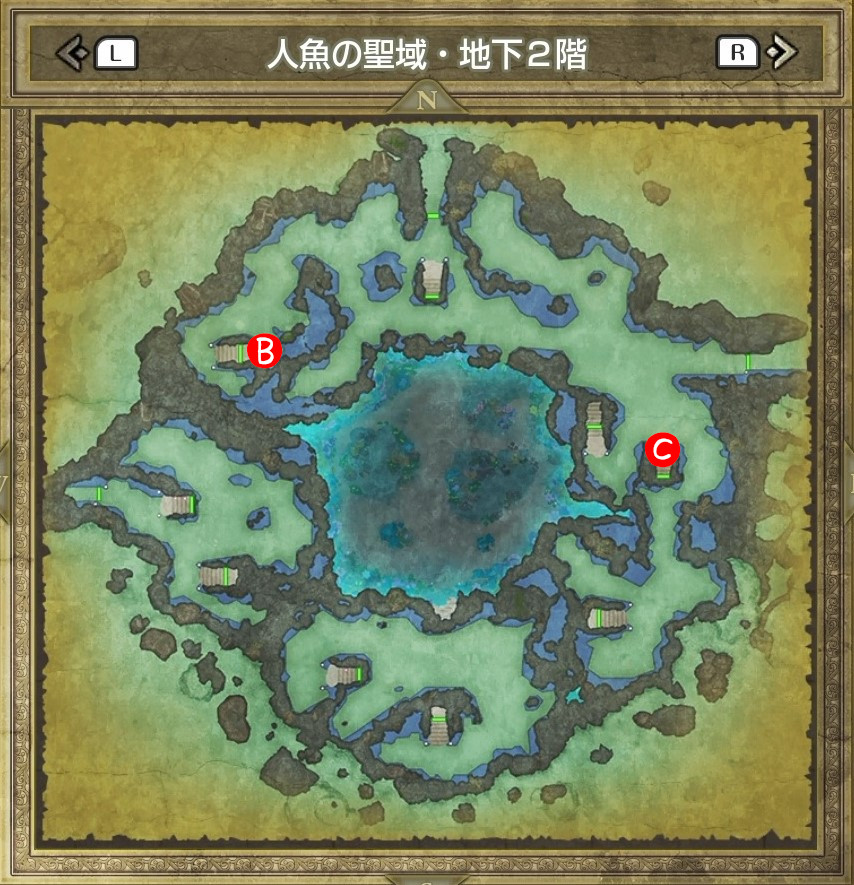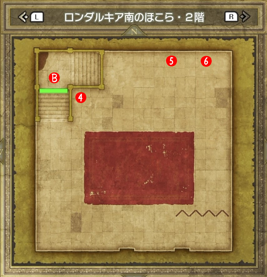 | B | 【ひみつの場所】 中央の木の袋から「レミラーマの巻物」 中央のツボから「ちからのたね」「かしこさのたね」 |