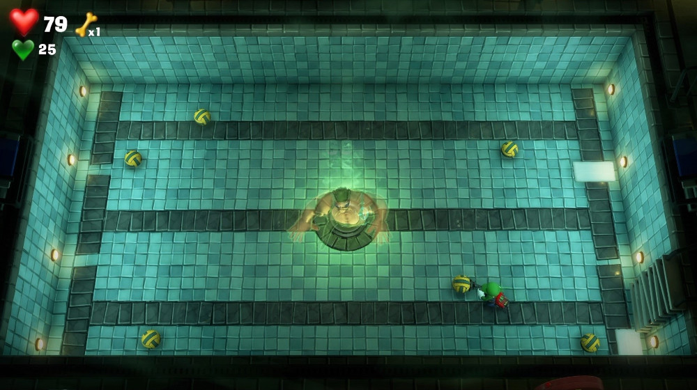グーイージが障害物や柱の後ろに隠れたら、ルイージがボールを吸い込んでタイミングよくマスカルポーロに当てる