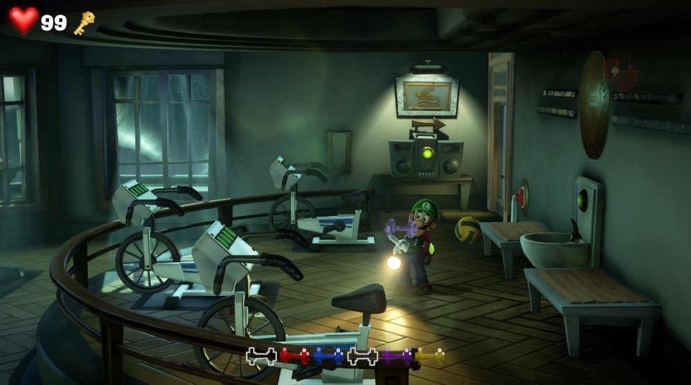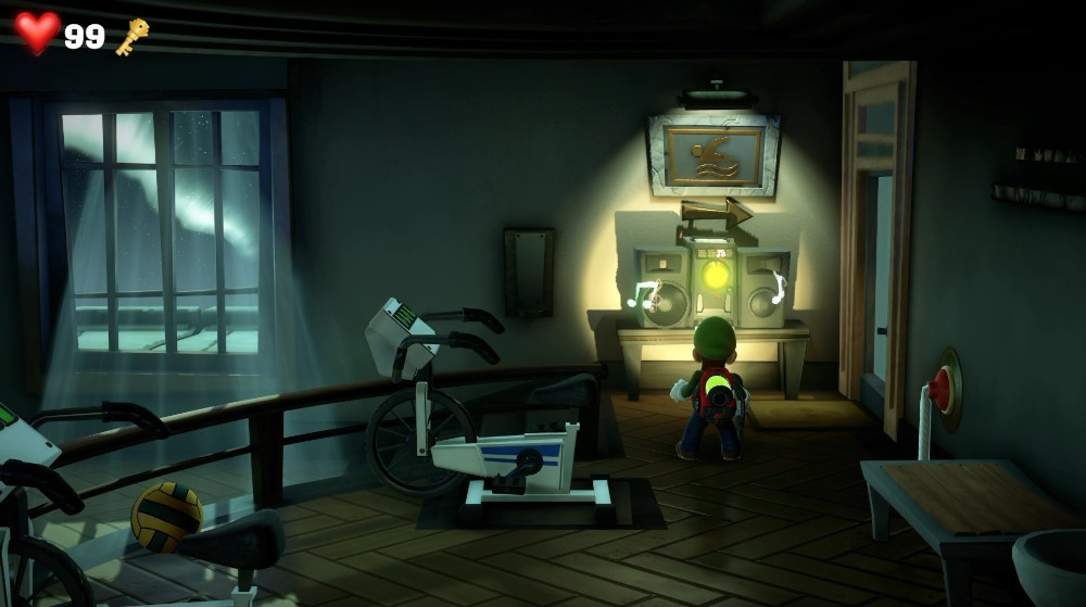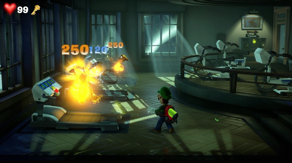 BGMと画面の色が変わってる状態の時にランニングマシンに向かってフラッシュを当てると、金のオバケ2体と宝石のオバケが出てきて戦闘になる