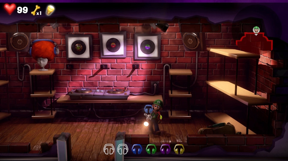ステージの床に2カ所ライトが消えた場所があるので、グーイージと協力して2つの場所に乗ると、コンセントが出現する