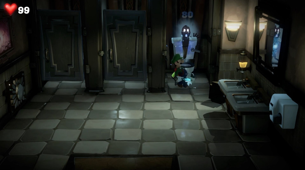 右のトイレの一番右の個室の扉をキューバンで破壊したら、新聞紙を吸い込むと宝石のオバケが出現する