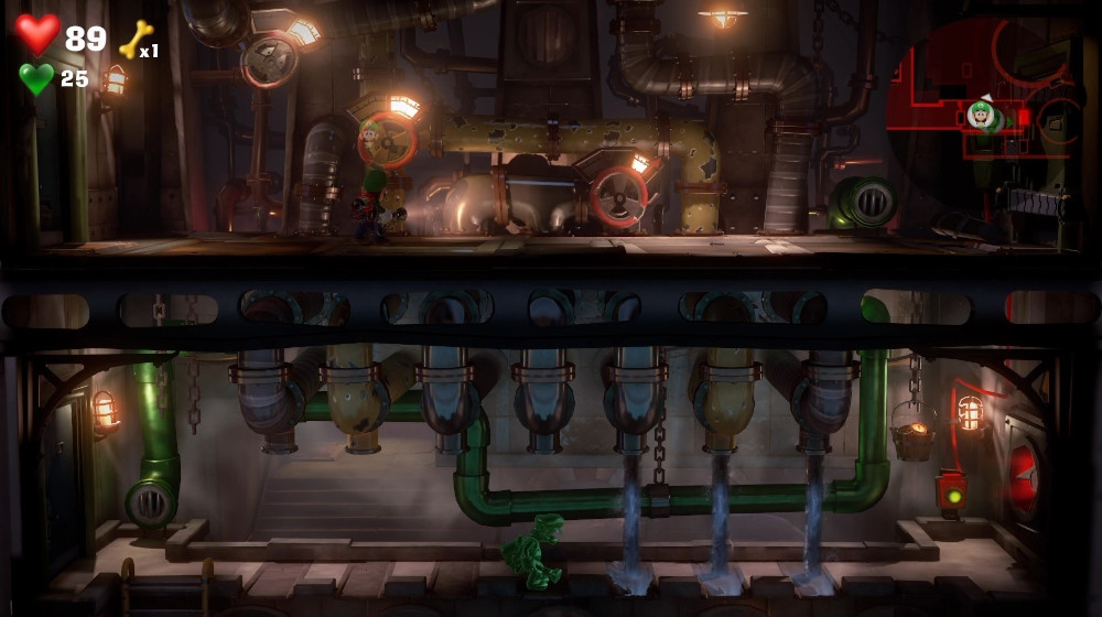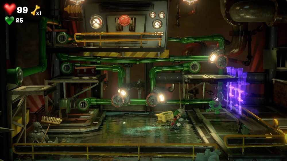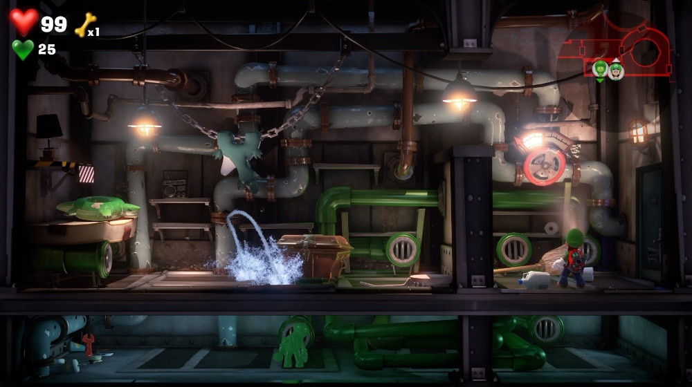ルイージでバルブを吸い込むと水が止まるので、グーイージは右側の配管に入って下層左側へ移動する