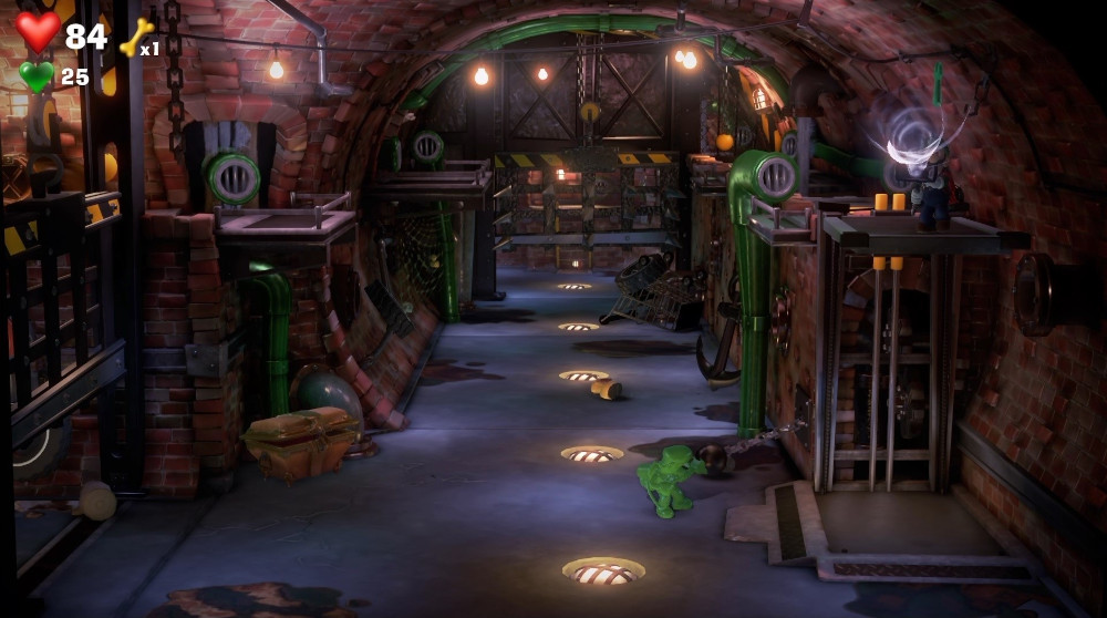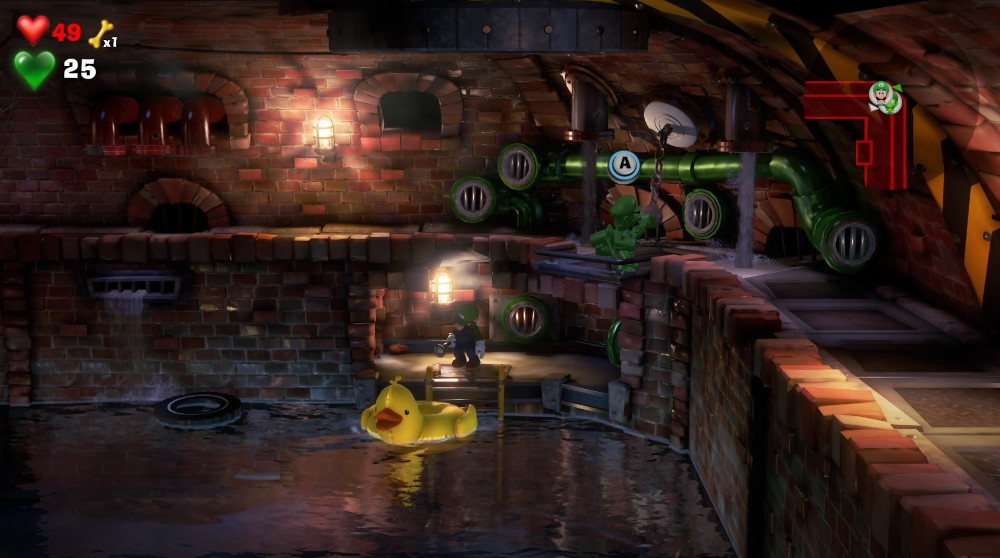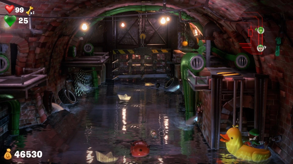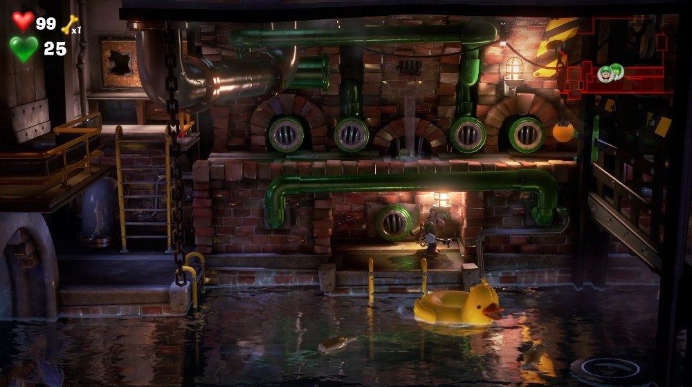 グーイージで配管を通って右端のオレンジの球を吸い込むと水路の鉄門が開くので、ルイージに切り替えて門をくぐる