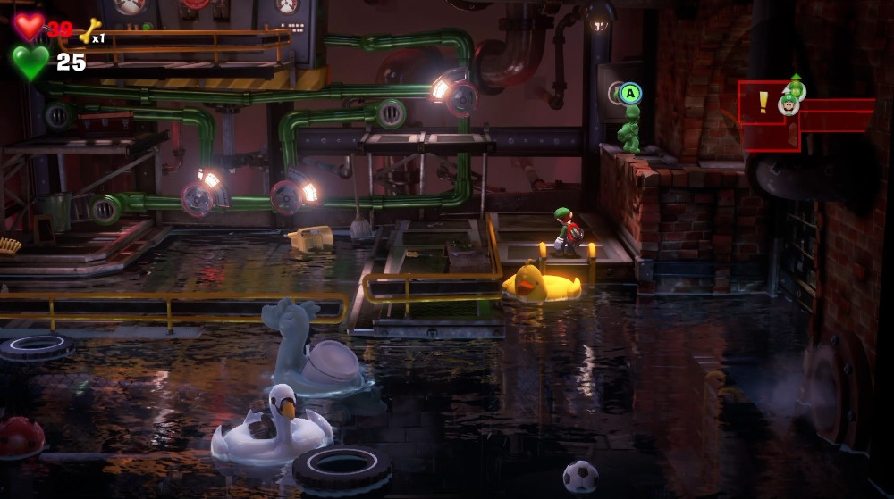 その後にルイージは浮き輪に乗って左へ移動したらオレンジの球を吸い込んで配管のフタを開けておく