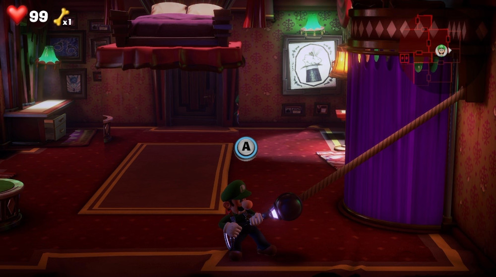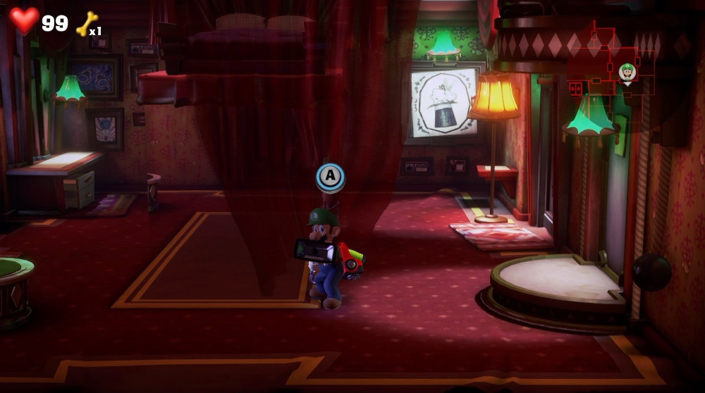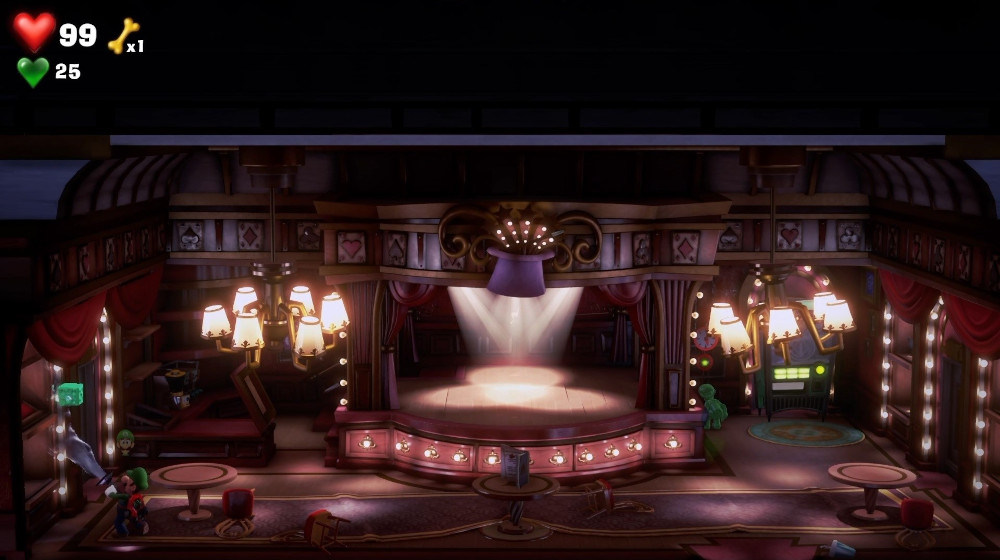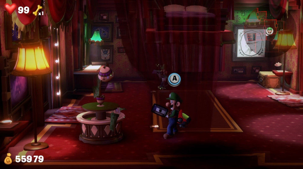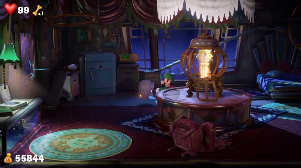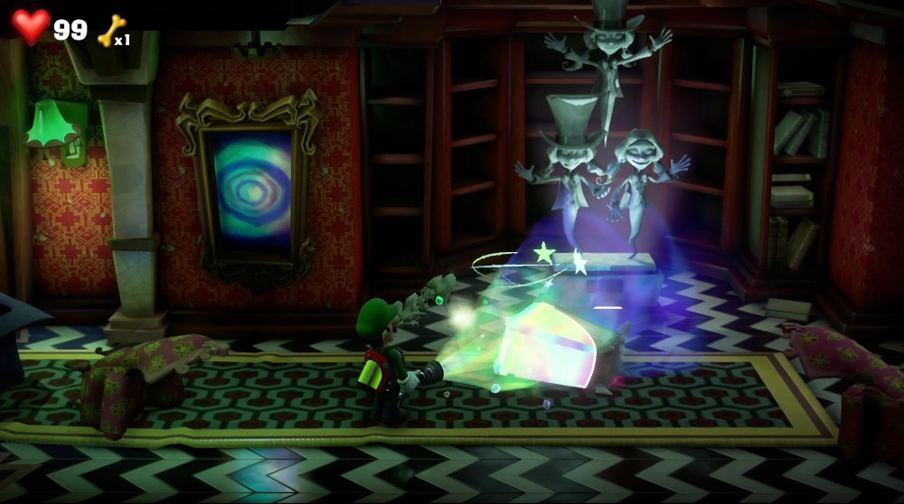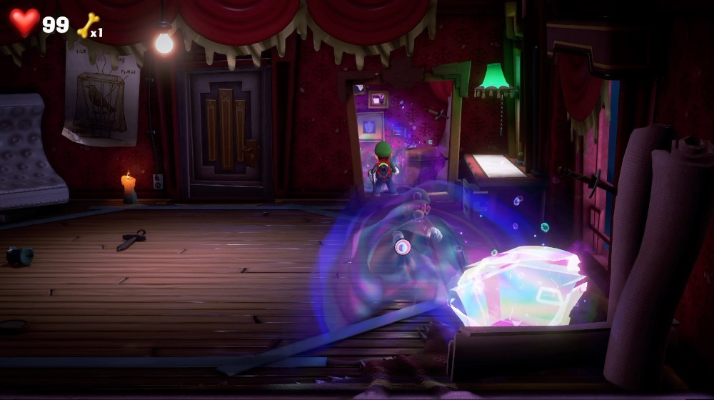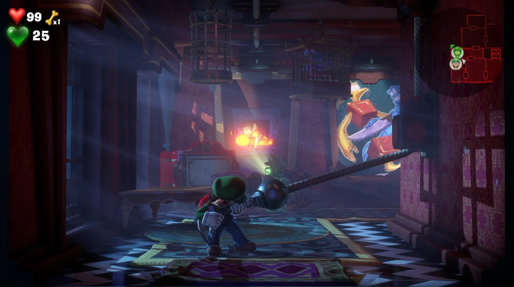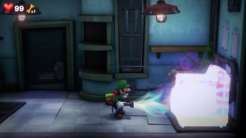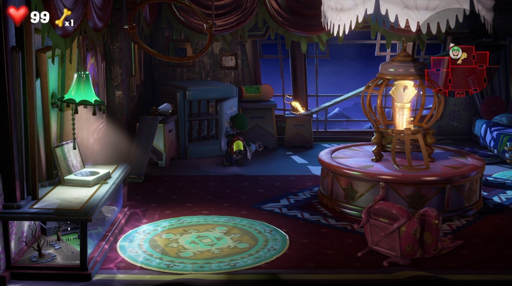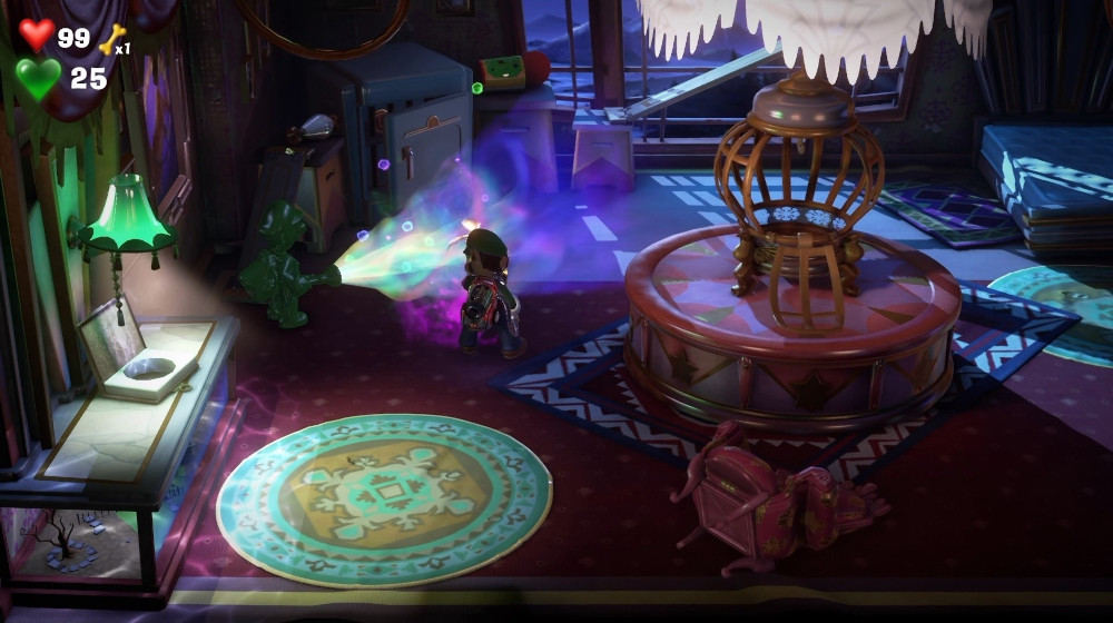 ルイージが吸い込んだ状態のまま、グーイージで緑のランプにフラッシュを当てると「緑の宝石」を入手しやすい