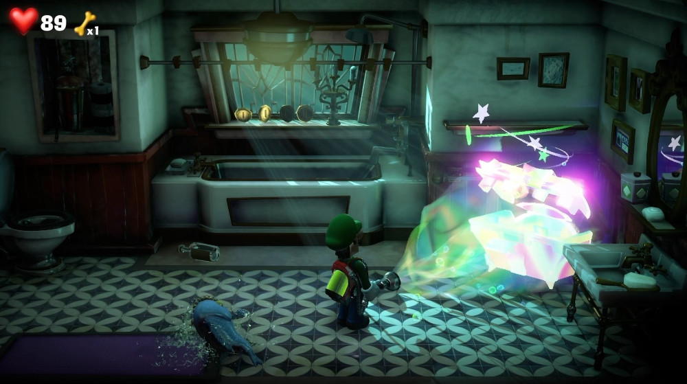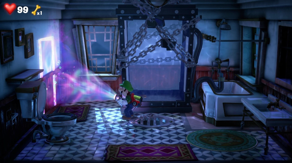 バスタブの後ろにあるコインの絵にダークライトを当てると実体化する