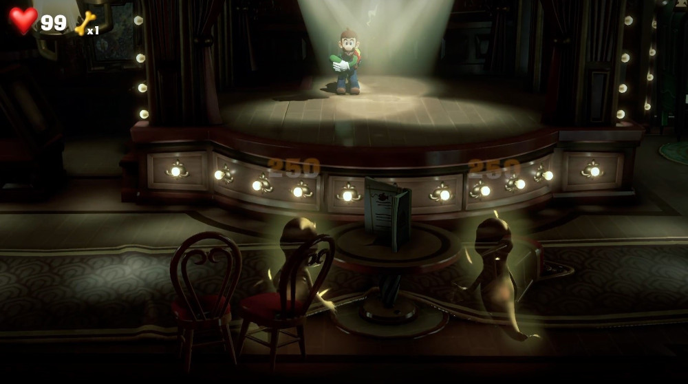 左のカウンターを「ZL+ZR」のバーストで開けて、スポットライトの下まで移動すると、金のオバケが出てきて戦闘になる